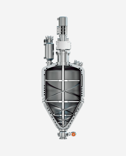 對筒體夾套、錐體夾套、攪拌器通入熱媒實(shí)現對罐內濾餅的持續加熱,此時(shí)攪拌器低速順時(shí)針轉動(dòng),使物料在罐內進(jìn)行多維運動(dòng)。 通過(guò)全方位的不規則往復運動(dòng),完成物料的高效率換熱,同時(shí),可向罐內通入熱的氣源,提升干燥效率。