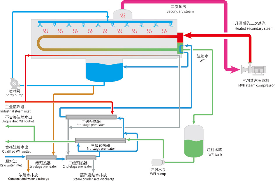 亞光最新研發(fā)生產(chǎn)的熱壓蒸餾水機使用了MVR節能技術(shù),具有產(chǎn)水優(yōu)質(zhì)、節能效果顯著(zhù)、安裝使用靈活等優(yōu)點(diǎn)。亞光熱壓蒸餾水機產(chǎn)量可從1T/h至100T/h[1],既可為客戶(hù)提供大處理量中心式制水方案,基于其超低的產(chǎn)量范圍和撬裝模塊化設計,也可為客戶(hù)提供靈活的分布式注射用水生產(chǎn)解決方案。